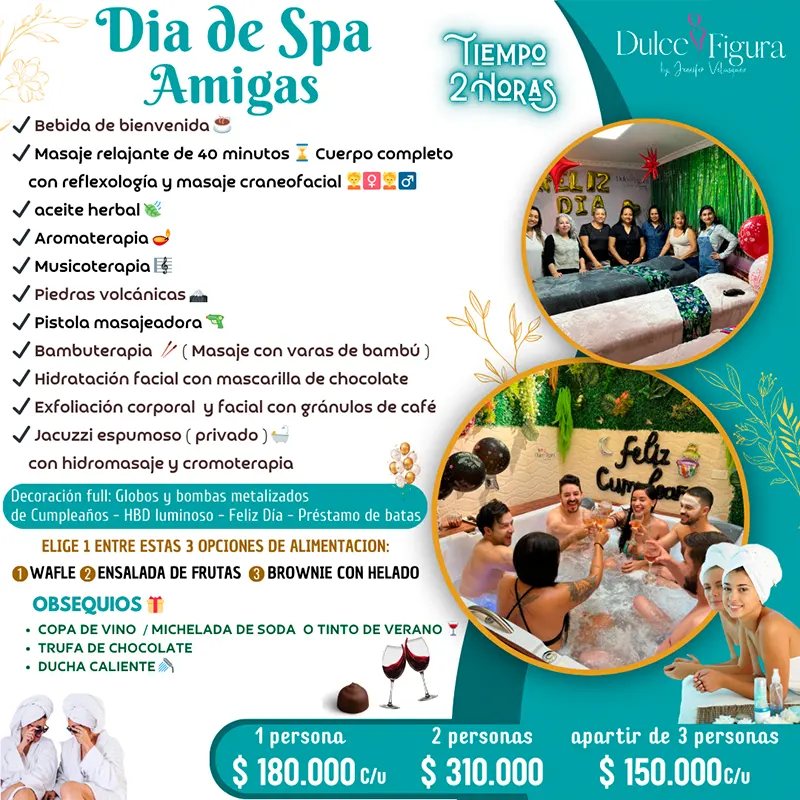 En el spa para celebrar cumpleaños debes llevar una toalla de uso personal y sandalias (opcional), traje de baño de 2 piezas, preferiblemente con desamarres en la parte de atrás. Si olvidaste tu ropa de baño, no te preocupes en Dulce Figura disponemos de pantytop o boxer desechables a la venta por un costo de $10,000 pesos c/uno.
