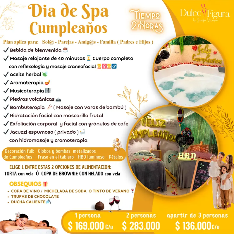 En Dulce Figura, encuentras un perfecto día de spa de cumpleaños 100% privado, especialmente diseñado para mimarte y consentirte como te lo mereces. disfruta de un momento de belleza y relajación, para regenerar tu cuerpo y mente, de manera integral.