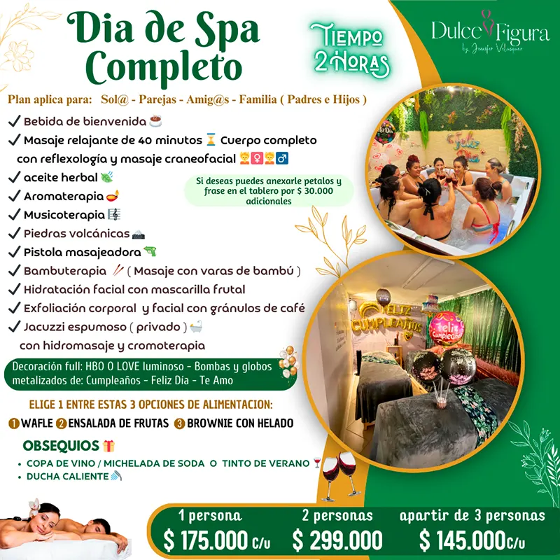 Para reservar tu día de spa en pareja, debes comunicarte a nuestro número de WhatsApp o diligenciar el formulario de contacto, la reserva se realiza con el 20% del valor total del servicio.